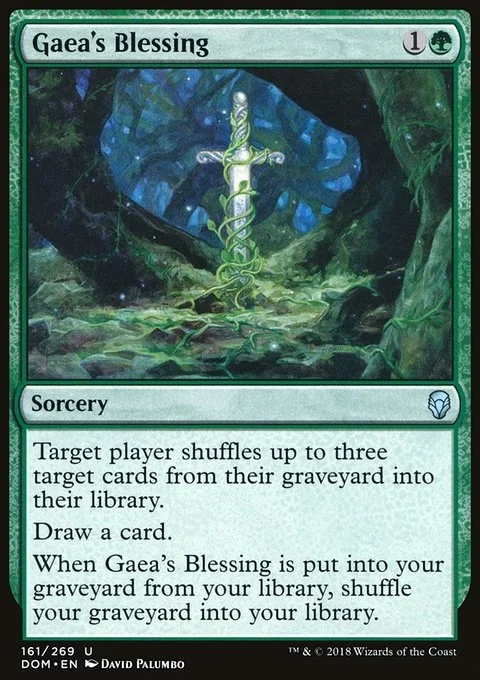 Target player shuffles up to three target cards from their graveyard into their library. Draw a card. When Gaea's Blessing is put into your graveyard from your library, shuffle your graveyard into your library.