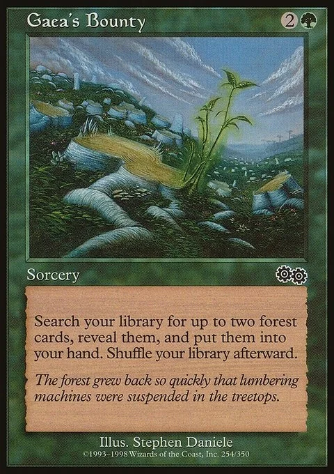 Search your library for up to two Forest cards, reveal those cards, put them into your hand, then shuffle.