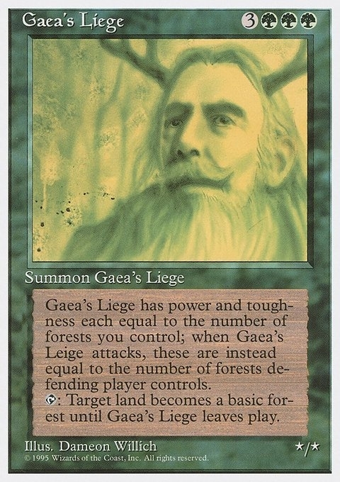 Gaea’s Liege has power and toughness each equal to the number of forests you control; when Gaea’s Liege attacks, these are instead equal to the number of forests defending player controls.T: Target land becomes a basic forest until Gaea’s Liege leaves play.