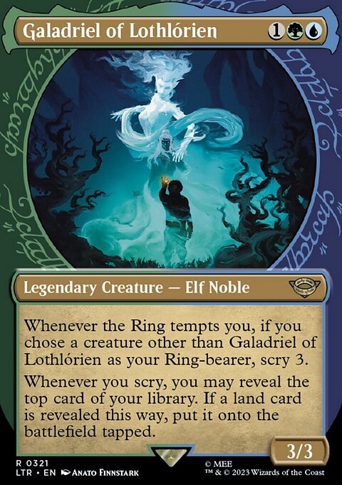 Whenever the Ring tempts you, if you chose a creature other than Galadriel as your Ring-bearer, scry 3. Whenever you scry, you may reveal the top card of your library. If a land card is revealed this way, put it onto the battlefield tapped.