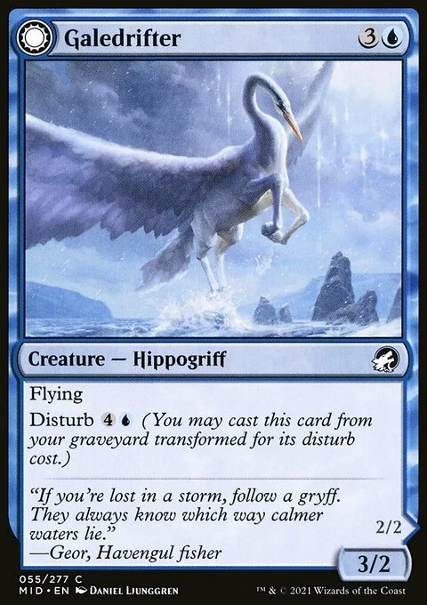 Galedrifter Flying Disturb {4}{U} (You may cast this card from your graveyard transformed for its disturb cost.) Waildrifter Flying If Waildrifter would be put into a graveyard from anywhere, exile it instead.