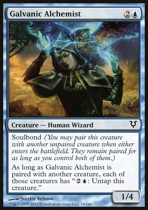 Soulbond (You may pair this creature with another unpaired creature when either enters the battlefield. They remain paired for as long as you control both of them.) As long as Galvanic Alchemist is paired with another creature, each of those creatures has "{2}{U}: Untap this creature."