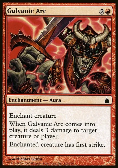 Enchant creature When Galvanic Arc enters, it deals 3 damage to any target. Enchanted creature has first strike.