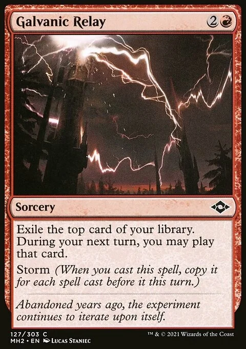 Exile the top card of your library. During your next turn, you may play that card. Storm (When you cast this spell, copy it for each spell cast before it this turn.)