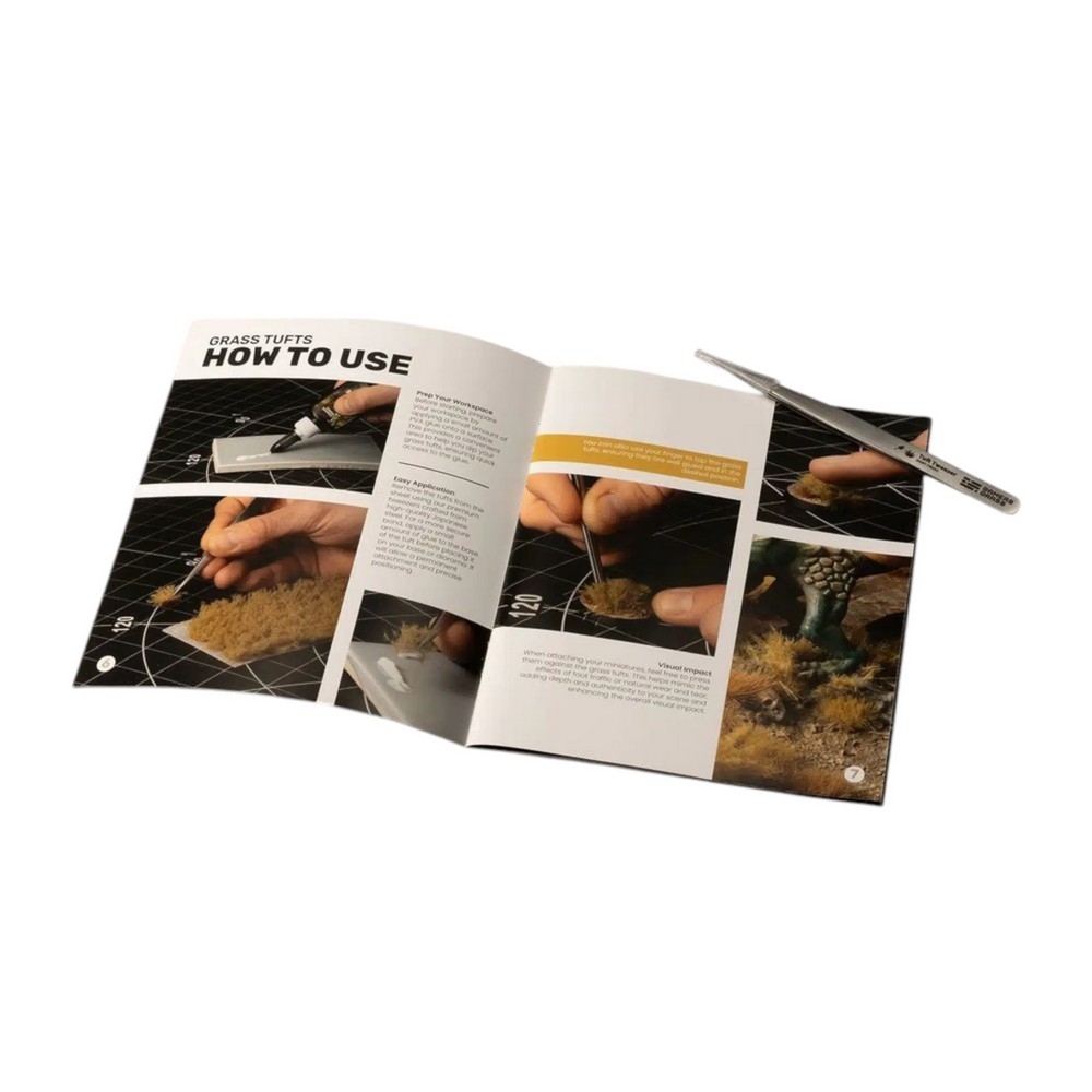 • This Starter Box contains 4 full sheets of Grass Tufts, 1 Pair of Tweezers, 1 Bottle of PVA glue, and 1 Basing Guide Booklet.