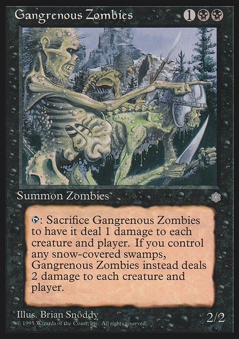 {T}, Sacrifice Gangrenous Zombies: Gangrenous Zombies deals 1 damage to each creature and each player. If you control a snow Swamp, Gangrenous Zombies deals 2 damage to each creature and each player instead.