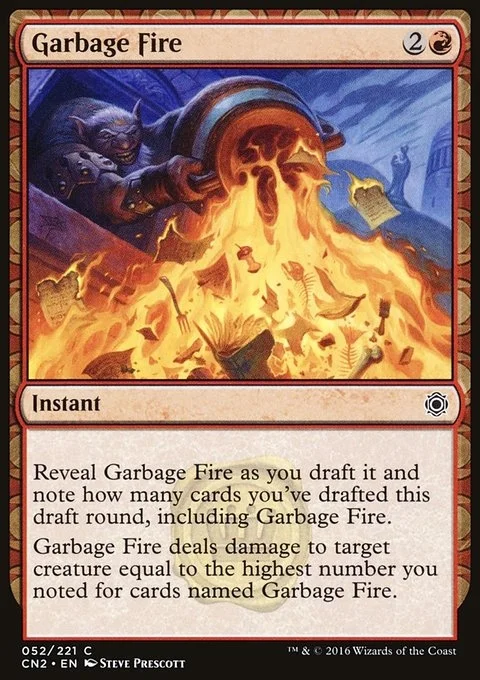Reveal this card as you draft it and note how many cards you've drafted this draft round, including this card. Garbage Fire deals damage to target creature equal to the highest number you noted for cards named Garbage Fire.