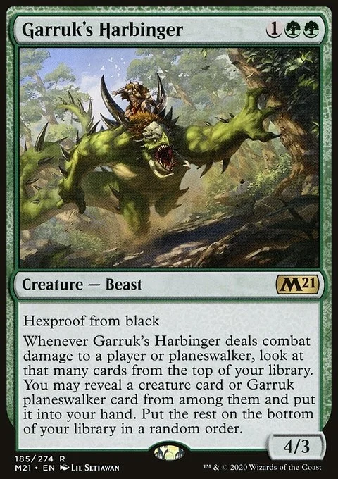 Hexproof from black Whenever Garruk's Harbinger deals combat damage to a player or planeswalker, look at that many cards from the top of your library. You may reveal a creature card or Garruk planeswalker card from among them and put it into your hand. Put the rest on the bottom of your library in a random order.