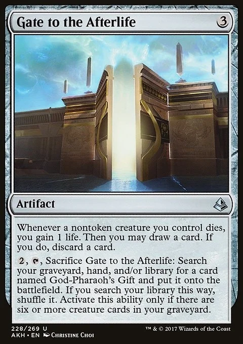 {2}, {T}, Sacrifice Gate to the Afterlife: Search your graveyard, hand, and/or library for a card named God-Pharaoh's Gift and put it onto the battlefield. If you search your library this way, shuffle. Activate only if there are six or more creature cards in your graveyard.
