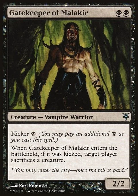 Kicker {B} (You may pay an additional {B} as you cast this spell.) When Gatekeeper of Malakir enters, if it was kicked, target player sacrifices a creature.