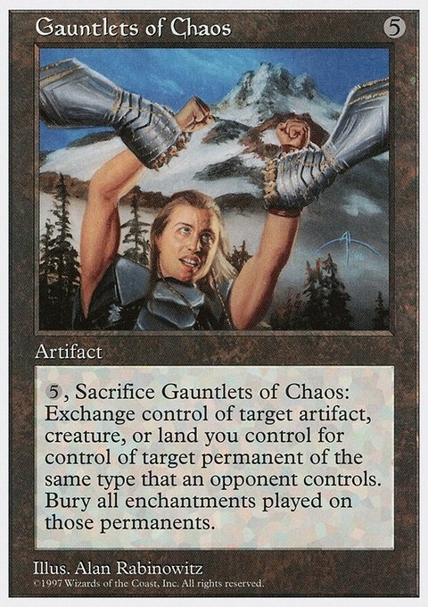 5, Sacrifice Gauntlets of Chaos: Exchange control of target artifact, creature, or land you control for control of target permanent of the same type that an opponent controls. Bury all enchantments played on those permanents.