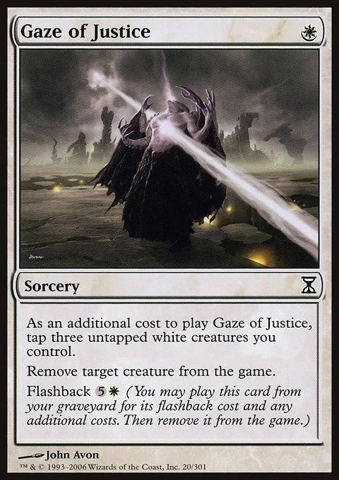 As an additional cost to cast this spell, tap three untapped white creatures you control. Exile target creature. Flashback {5}{W} (You may cast this card from your graveyard for its flashback cost and any additional costs. Then exile it.)