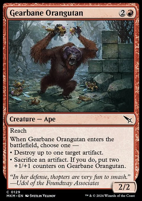 Reach When this creature enters, choose one — • Destroy up to one target artifact. • Sacrifice an artifact. If you do, put two +1/+1 counters on this creature.