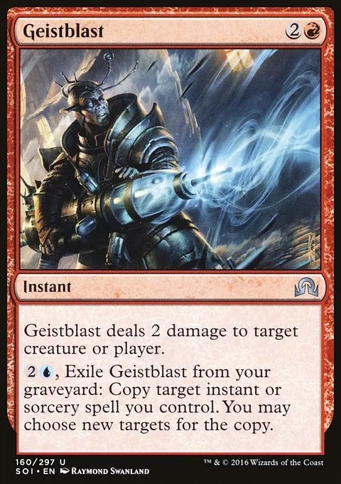 Geistblast deals 2 damage to any target. {2}{U}, Exile Geistblast from your graveyard: Copy target instant or sorcery spell you control. You may choose new targets for the copy.