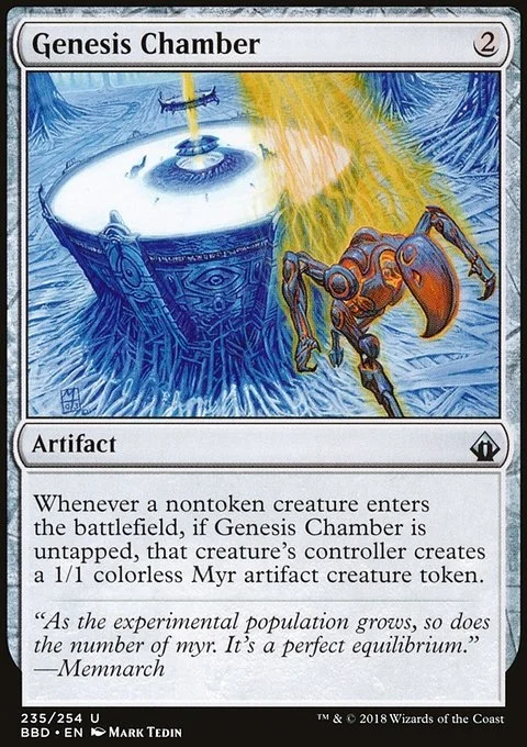 Whenever a nontoken creature enters the battlefield, if Genesis Chamber is untapped, that creature's controller creates a 1/1 colorless Myr artifact creature token.