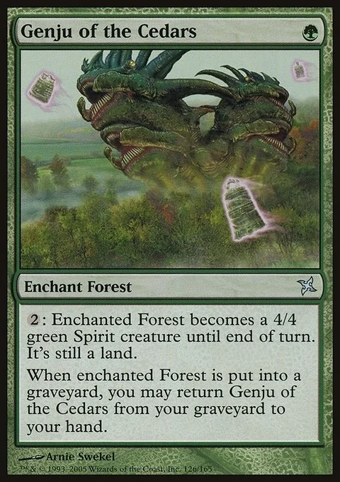 Enchant Forest {2}: Enchanted Forest becomes a 4/4 green Spirit creature until end of turn. It's still a land. When enchanted Forest is put into a graveyard, you may return Genju of the Cedars from your graveyard to your hand.