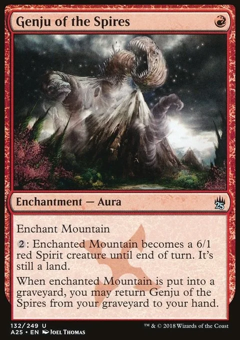Enchant Mountain {2}: Enchanted Mountain becomes a 6/1 red Spirit creature until end of turn. It's still a land. When enchanted Mountain is put into a graveyard, you may return Genju of the Spires from your graveyard to your hand.
