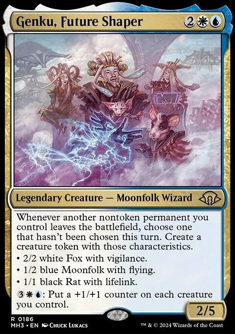 Whenever another nontoken permanent you control leaves the battlefield, choose one that hasn't been chosen this turn. Create a creature token with those characteristics. • 2/2 white Fox with vigilance. • 1/2 blue Moonfolk with flying. • 1/1 black Rat with lifelink. {3}{W}{U}: Put a +1/+1 counter on each creature you control.