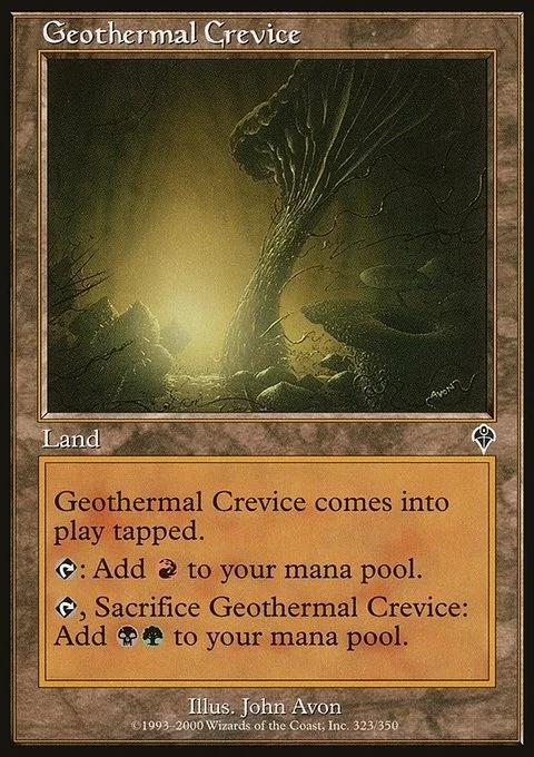 Geothermal Crevice enters the battlefield tapped. {T}: Add {R}. {T}, Sacrifice Geothermal Crevice: Add {B}{G}.