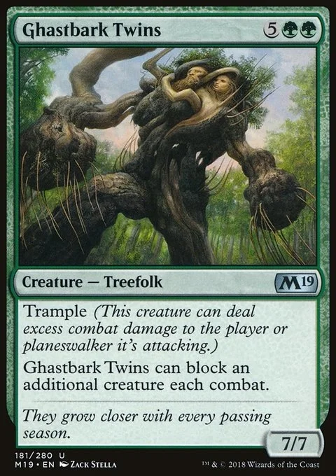 Trample (This creature can deal excess combat damage to the player or planeswalker it's attacking.) Ghastbark Twins can block an additional creature each combat.