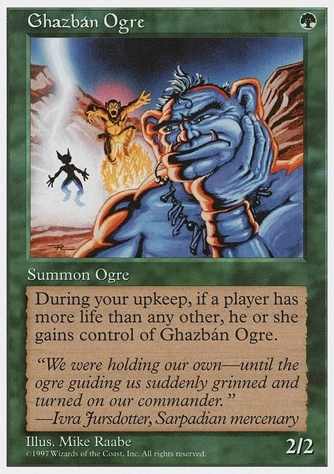 At the beginning of your upkeep, if a player has more life than each other player, the player with the most life gains control of Ghazbán Ogre.