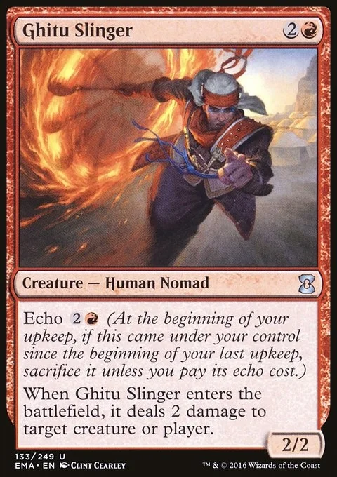 Echo {2}{R} (At the beginning of your upkeep, if this came under your control since the beginning of your last upkeep, sacrifice it unless you pay its echo cost.) When Ghitu Slinger enters the battlefield, it deals 2 damage to any target.