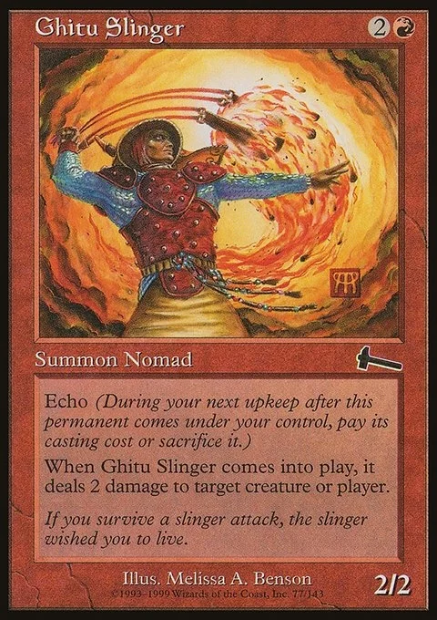 Echo {2}{R} (At the beginning of your upkeep, if this came under your control since the beginning of your last upkeep, sacrifice it unless you pay its echo cost.) When Ghitu Slinger enters the battlefield, it deals 2 damage to any target.