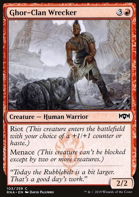 Riot (This creature enters with your choice of a +1/+1 counter or haste.) Menace (This creature can't be blocked except by two or more creatures.)