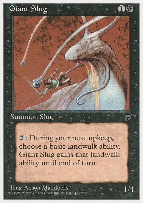 {5}: At the beginning of your next upkeep, choose a basic land type. Giant Slug gains landwalk of the chosen type until the end of that turn. (It can't be blocked as long as defending player controls a land of that type.)