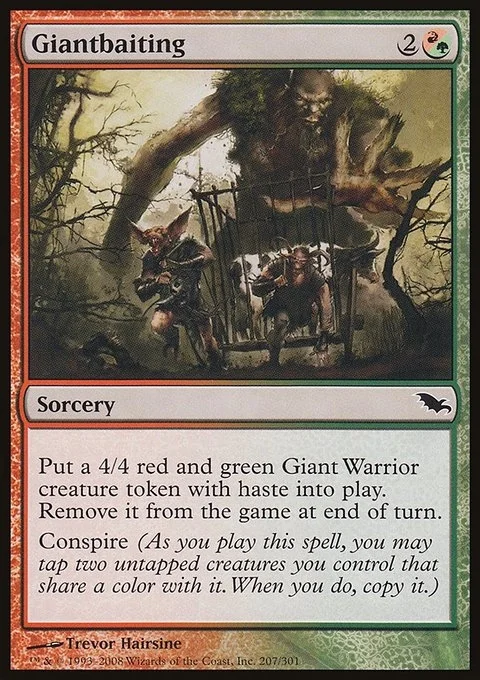 Create a 4/4 red and green Giant Warrior creature token with haste. Exile it at the beginning of the next end step. Conspire (As you cast this spell, you may tap two untapped creatures you control that share a color with it. When you do, copy it.)