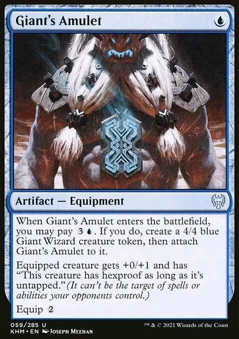 When Giant's Amulet enters the battlefield, you may pay {3}{U}. If you do, create a 4/4 blue Giant Wizard creature token, then attach Giant's Amulet to it.
