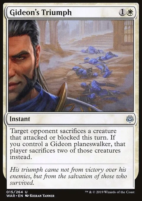 Target opponent sacrifices a creature that attacked or blocked this turn. If you control a Gideon planeswalker, that player sacrifices two of those creatures instead.