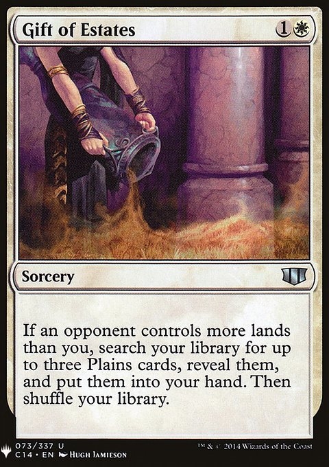 If an opponent controls more lands than you, search your library for up to three Plains cards, reveal them, put them into your hand, then shuffle.