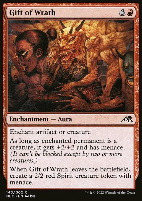 When this Aura leaves the battlefield, create a 2/2 red Spirit creature token with menace.