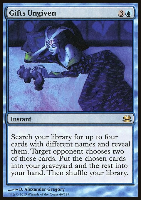Search your library for up to four cards with different names and reveal them. Target opponent chooses two of those cards. Put the chosen cards into your graveyard and the rest into your hand. Then shuffle your library.