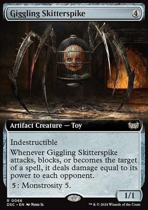 Whenever Giggling Skitterspike attacks, blocks, or becomes the target of a spell, it deals damage equal to its power to each opponent.