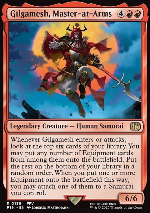Whenever Gilgamesh enters or attacks, look at the top six cards of your library. You may put any number of Equipment cards from among them onto the battlefield. Put the rest on the bottom of your library in a random order. When you put one or more Equipment onto the battlefield this way, you may attach one of them to a Samurai you control.