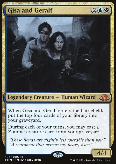 When Gisa and Geralf enters the battlefield, mill four cards. Once during each of your turns, you may cast a Zombie creature spell from your graveyard.