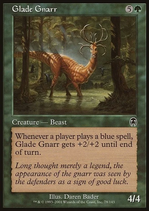 Whenever a player casts a blue spell, Glade Gnarr gets +2/+2 until end of turn.