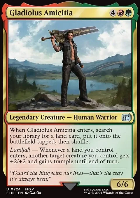 When Gladiolus Amicitia enters, search your library for a land card, put it onto the battlefield tapped, then shuffle. Landfall — Whenever a land you control enters, another target creature you control gets +2/+2 and gains trample until end of turn.