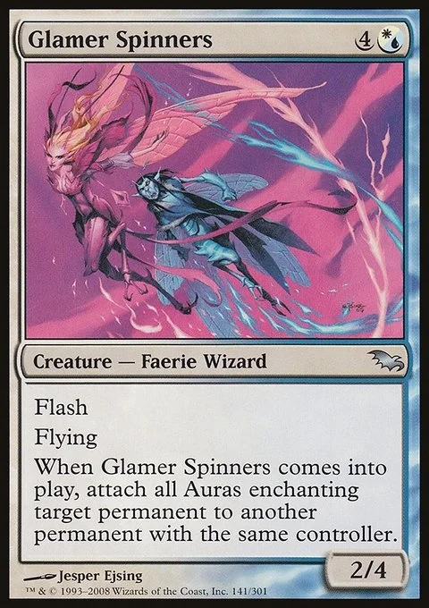When Glamer Spinners comes into play, attach all Auras enchanting target permanent to another permanent with the same controller.