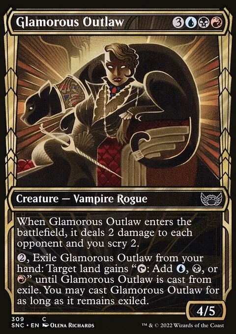 When this creature enters, it deals 2 damage to each opponent and you scry 2. {2}, Exile this card from your hand: Target land gains "{T}: Add {U}, {B}, or {R}" until this card is cast from exile. You may cast this card for as long as it remains exiled.