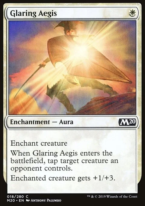 Enchant creature When Glaring Aegis enters the battlefield, tap target creature an opponent controls. Enchanted creature gets +1/+3.
