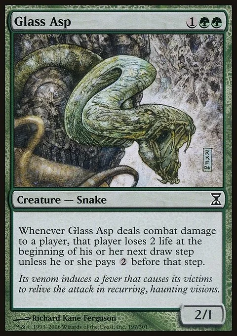 Whenever Glass Asp deals combat damage to a player, that player loses 2 life at the beginning of their next draw step unless they pay {2} before that step.