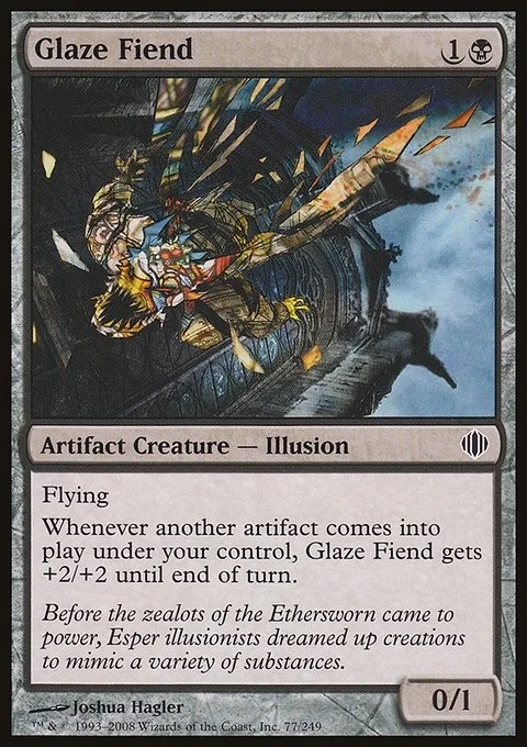 Flying Whenever another artifact you control enters, Glaze Fiend gets +2/+2 until end of turn.