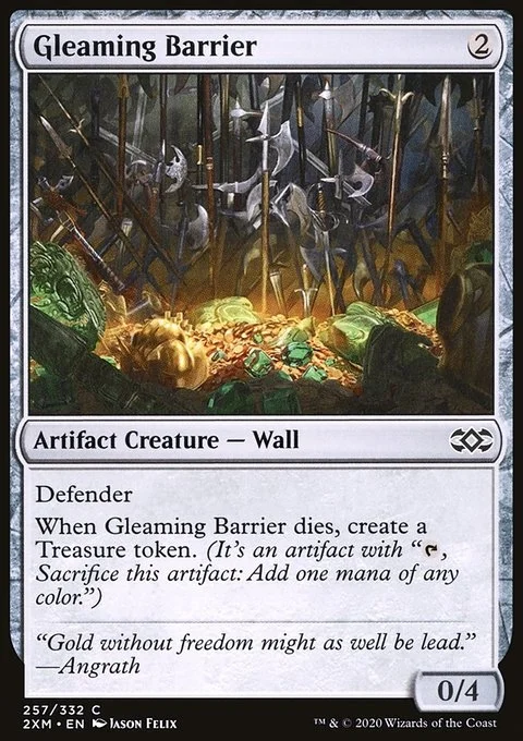 Defender When Gleaming Barrier dies, create a Treasure token. (It's an artifact with "{T}, Sacrifice this artifact: Add one mana of any color.")