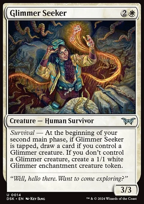 Survival — At the beginning of your second main phase, if Glimmer Seeker is tapped, draw a card if you control a Glimmer creature. If you don't control a Glimmer creature, create a 1/1 white Glimmer enchantment creature token.