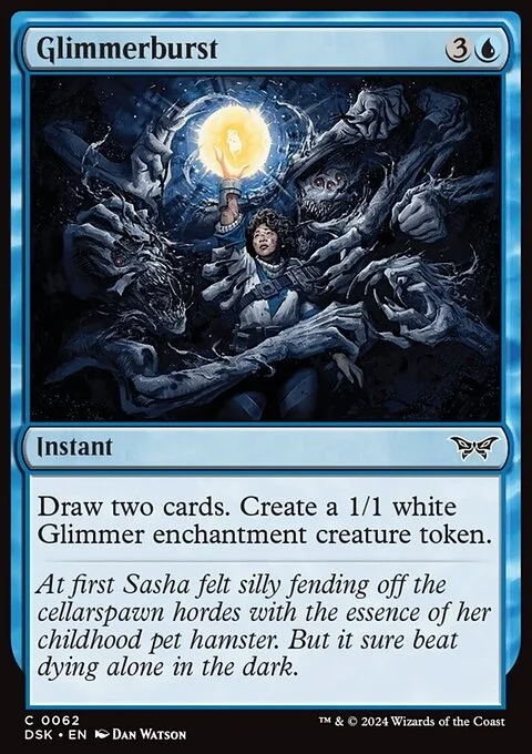 Draw two cards. Create a 1/1 white Glimmer enchantment creature token.