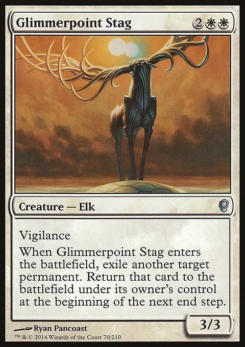 Vigilance When Glimmerpoint Stag enters the battlefield, exile another target permanent. Return that card to the battlefield under its owner's control at the beginning of the next end step.