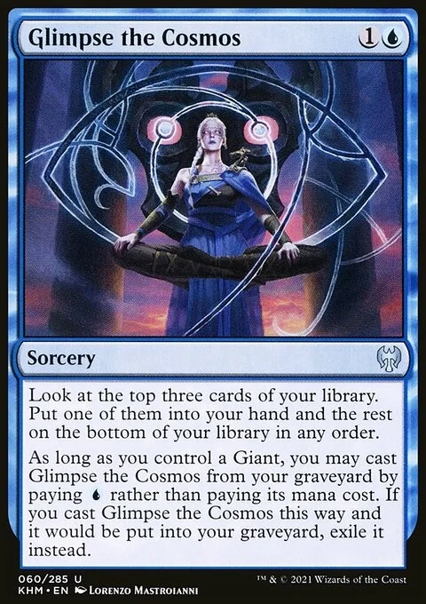 As long as you control a Giant, you may cast Glimpse the Cosmos from your graveyard by paying {U} rather than paying its mana cost. If you cast Glimpse the Cosmos this way and it would be put into your graveyard, exile it instead.